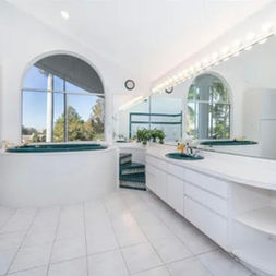 This bathroom was envisioned as a luxurious retreat with a modern and sophisticated design. The centerpiece, a freestanding tub set against a dramatic arched window, creates a spa-like atmosphere that blurs the line between indoors and outdoors. Dark cabinetry brings depth and contrast to the space, complemented by sleek white countertops and minimalist floating vanities. Bold brass fixtures add a touch of elegance and warmth, becoming statement pieces in their own right. Large-format floor tiles and soft lighting enhance the clean architectural lines, while lush greenery introduces a natural element for balance. Every detail was curated to deliver a sense of serenity and refined style, making this bathroom a true sanctuary.